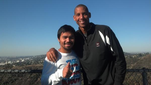 Boxing icon Manny Pacquiao poses for a picture with basketball Hall of Famer Reggie Miller after a morning run. Pacquiao and his trainer Freddie Roach are set to be interviewed for TNT, the network Miller appears on. Reggie Miller Twitter - @reggiemillertnt