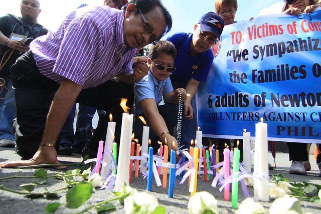 Dante Jimenez of the Volunteers Against Crime and Corruption (VACC) leads members in lighting candles in front of the US Embassy in Manila on Tuesday to express their sympathy over the Sandy Hook Elementary School shooting spree on Dec. 15 that left 26 people dead, including 20 young school children. Danny Pata