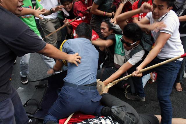 Activists calling for the scrapping of the Visiting Forces Agreement and the immediate removal of the USS Guardian from Tubbataha Reef clash with anti-riot policemen along UN Avenue in Manila on Tuesday as they march toward the US Embassy. GMA News